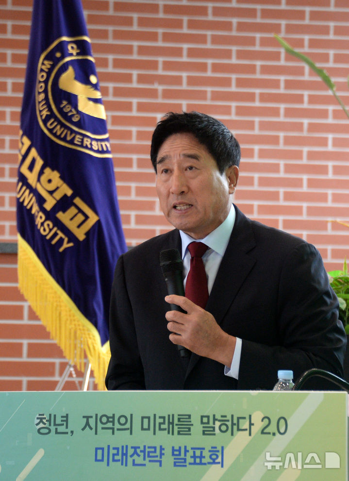 [완주=뉴시스] 김얼 기자 = 박노준 우석대학교 총장이 16일 전북 완주군 우석대학교에서 열린 '청년, 지역의 미래를 말하다 2.0 미래전략 발표회'에 참석해 개회사를 하고 있다. 2025.10.16. [email protected]