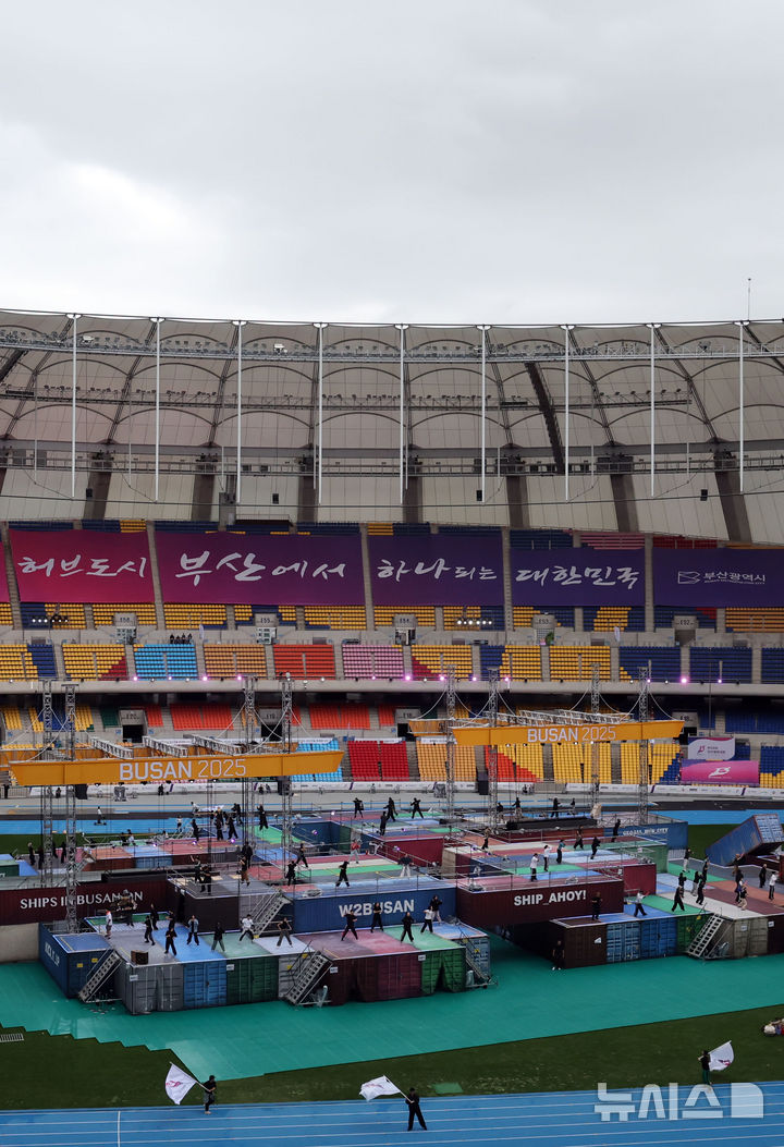 [부산=뉴시스] 하경민 기자 = 16일 부산 연제구 부산아시아드주경기장에서 제106회 부산 전국체육대회 개회식 공연 리허설이 열리고 있다.