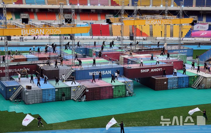 [부산=뉴시스] 하경민 기자 = 16일 부산 연제구 부산아시아드주경기장에서 제106회 부산 전국체육대회 개회식 공연 리허설이 열리고 있다.