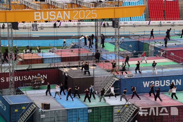 [부산=뉴시스] 하경민 기자 = 16일 부산 연제구 부산아시아드주경기장에서 제106회 부산 전국체육대회 개회식 공연 리허설이 열리고 있다.