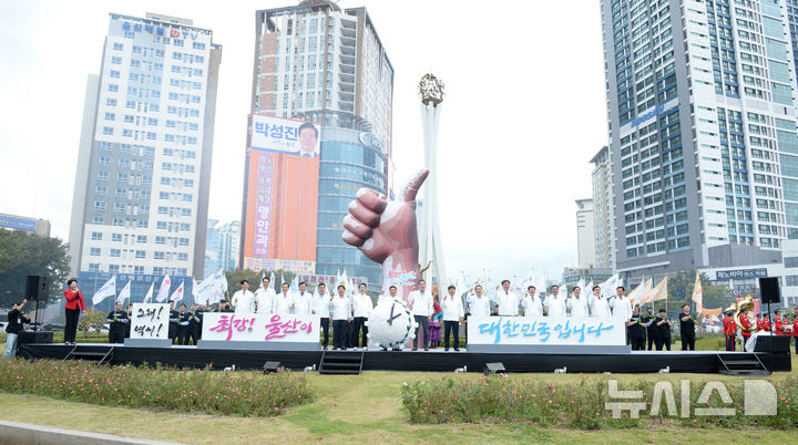 [울산=뉴시스] 배병수 기자 = 16일 오후 울산 남구 공업탑에서 열린 ‘2025년 울산공업축제’ 개막식에서 김두겸 시장 등 참석자들이 축하 세리머니를 하고 있다[email protected].