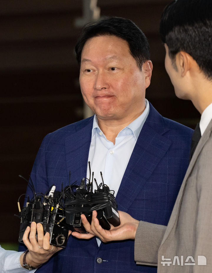 [서울=뉴시스] 황준선 기자 = 최태원 SK그룹 회장이 16일 오후 서울 강서구 김포비즈니스항공센터를 통해 미국으로 출국하며 취재진의 질문을 듣고 있다.