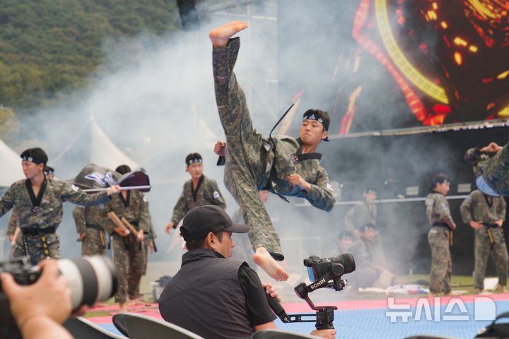 [칠곡=뉴시스] 박홍식 기자 =17일 경북 칠곡군 칠곡보 생태공원에서 열린 '제12회 칠곡낙동강평화축제' 개막식에 앞서 육군 태권도 시범단이 태권도 시범을 보이고 있다. 2025.10.17 [email protected]