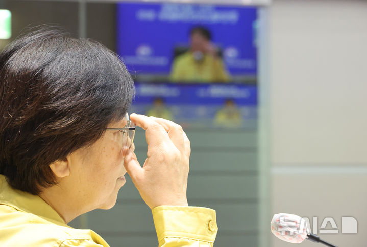 [서울=뉴시스] 김명원 기자 = 정은경 중앙재난안전대책본부 제1차장(보건복지부 장관)이 17일 오전 서울 종로구 정부서울청사 중앙재난안전상황실 서울상황센터에서 열린 의사 집단행동 중앙재난안전대책본부(중대본) 회의에 참석해 안경을 고쳐쓰고있다. 2025.10.17. [email protected]