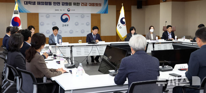 [세종=뉴시스] 강종민 기자 = 최교진 교육부 장관이 17일 세종시 정부세종청사에서 대학·전문대학 학생처장협의회 회장단과 가진 대학생 해외활동 안전 강화를 위한 긴급 대응회의에서 학생 안전과 피해 예방을 위한 방안을 논의하고 있다. 2025.10.17. [email protected]