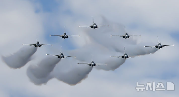 [성남=뉴시스] 김근수 기자 = 서울ADEX 2025 개막 첫 날인 17일 오전 경기 성남시 서울공항에서 공군 블랙이글스가 상공에서 축하비행을 하고 있다. 2025.10.17. [email protected]