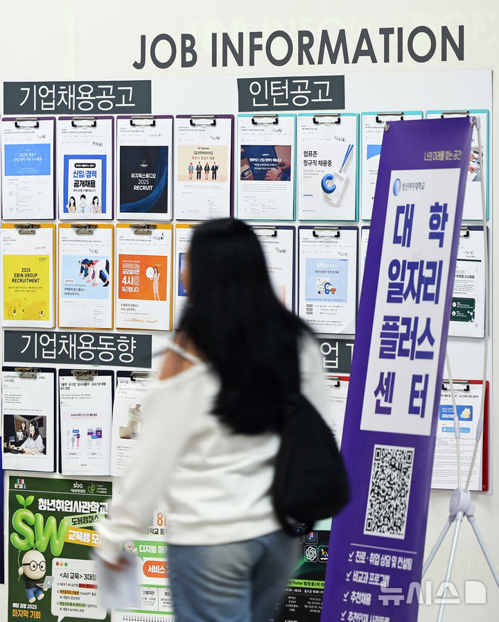 [서울=뉴시스] 최진석 기자 = 국가데이터처 '2025년 9월 고용동향'에 따르면 취업자 수가 전년 동월 대비 31만2000명 증가하며 19개월 만에 가장 큰 폭으로 뛴 것으로 나타난 17일 서울 성북구 한 대학교 일자리플러스 센터에 취업 관련 안내문이 붙어 있다.