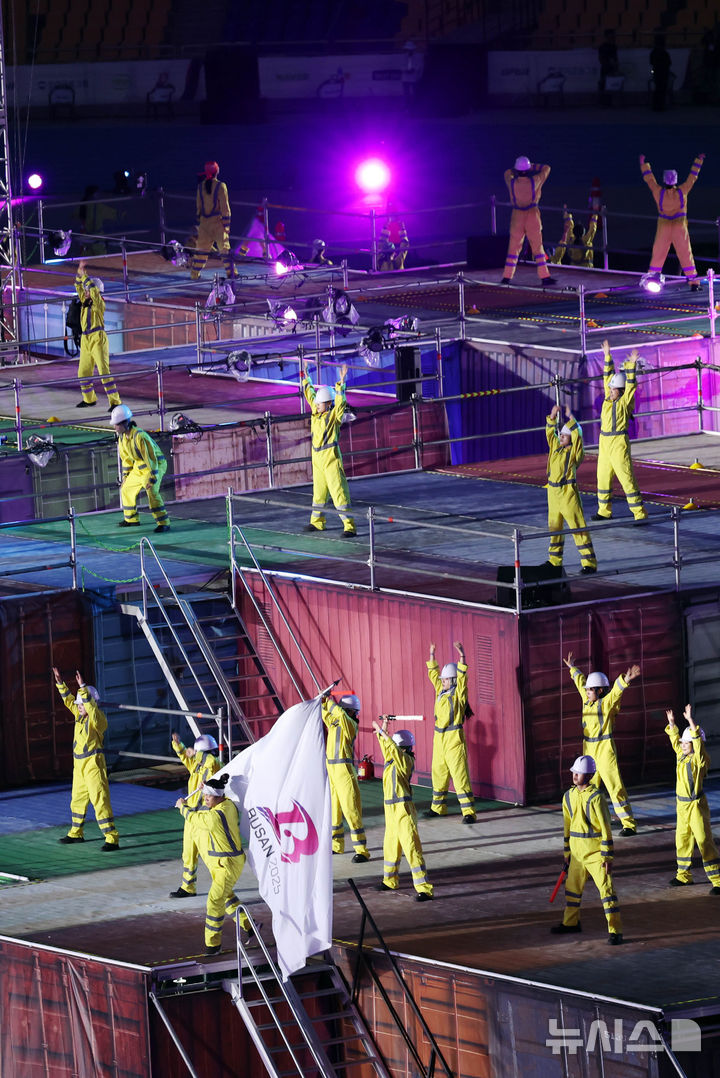 [부산=뉴시스] 하경민 기자 = 제106회 부산 전국체육대회 개회식이 열린 17일 부산 연제구 부산아시아드주경기장에서 축하공연이 펼쳐지고 있다.