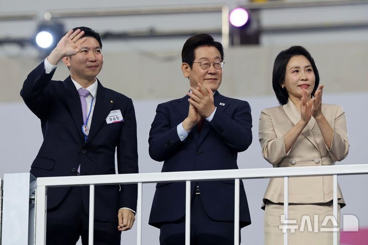 [부산=뉴시스] 황준선 기자 = 이재명 대통령과 김혜경 여사가 17일 오후 부산 연제구 부산아시아드주경기장에서 열린 제106회 전국체육대회 개회식에 참석해 입장하는 선수단에 박수를 보내고 있다. 왼쪽은 유승민 대한체육회장. 2025.10.17. [email protected]