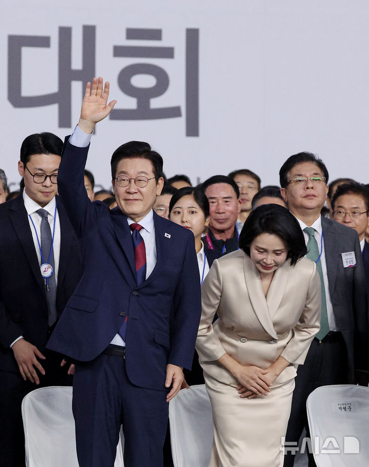 [서울=뉴시스] 최동준 기자 = 이재명 대통령과 김혜경 여사가 17일 부산아시아드주경기장에서 열린 제106회 전국체육대회 개막식에 입장하며 인사하고 있다. (대통령실통신사진기자단) 2025.10.17. [email protected]