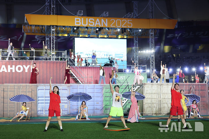 [부산=뉴시스] 황준선 기자 = 17일 오후 부산 연제구 부산아시아드주경기장에서 열린 제106회 전국체육대회 개회식에서 기념 공연이 열리고 있다. 2025.10.17. [email protected]