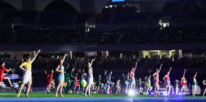 [부산=뉴시스] 황준선 기자 = 17일 오후 부산 연제구 부산아시아드주경기장에서 열린 제106회 전국체육대회 개회식에서 기념 공연이 열리고 있다. 2025.10.17. [email protected]
