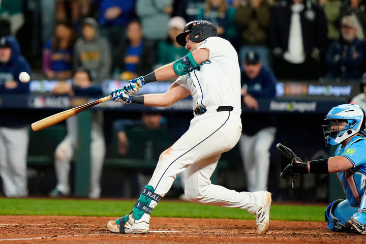 [시애틀=AP/뉴시스] 시애틀 매리너스 포수 칼 롤리가 17일(현지 시간) 미 워싱턴주 시애틀의 T-모바일 파크에서 열린 2025 메이저리그 아메리칸리그 챔피언십 시리즈(ALCS·7전4선승제) 5차전 토론토 블루제이스와 경기 8회 말 1점 동점 홈런을 치고 있다. 시애틀은 이후 에우헤니오 수아레스의 역전 만루포로 6-2로 승리, 3승 2패를 기록하면서 월드시리즈(WS)까지 1승만을 남겨뒀다. 2025.10.18.