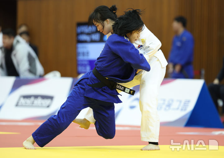 [부산=뉴시스] 황준선 기자 = 허미미(경북체육회)가 이수빈(부산북구청)가 18일 오후 부산 남구 부경대학교 체육관에서 열린 제106회 전국체육대회 유도 여자 일반부 -57kg 8강 경기를 치르고 있다. 2025.10.18. [email protected]