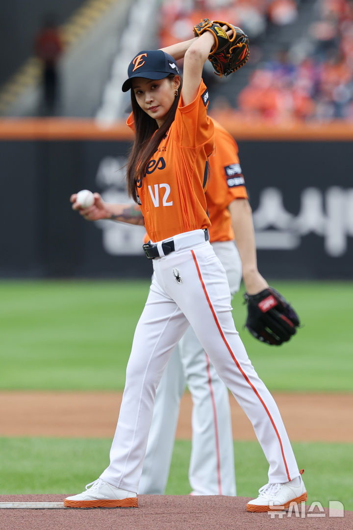 [대전=뉴시스] 김진아 기자 = 배우 겸 가수 권유리가 18일 대전 중구 한화생명볼파크에서 열린 2025 KBO 포스트시즌 삼성 라이온즈와 한화 이글스의 경기에서 시구를 하고 있다. 2025.10.18. [email protected]