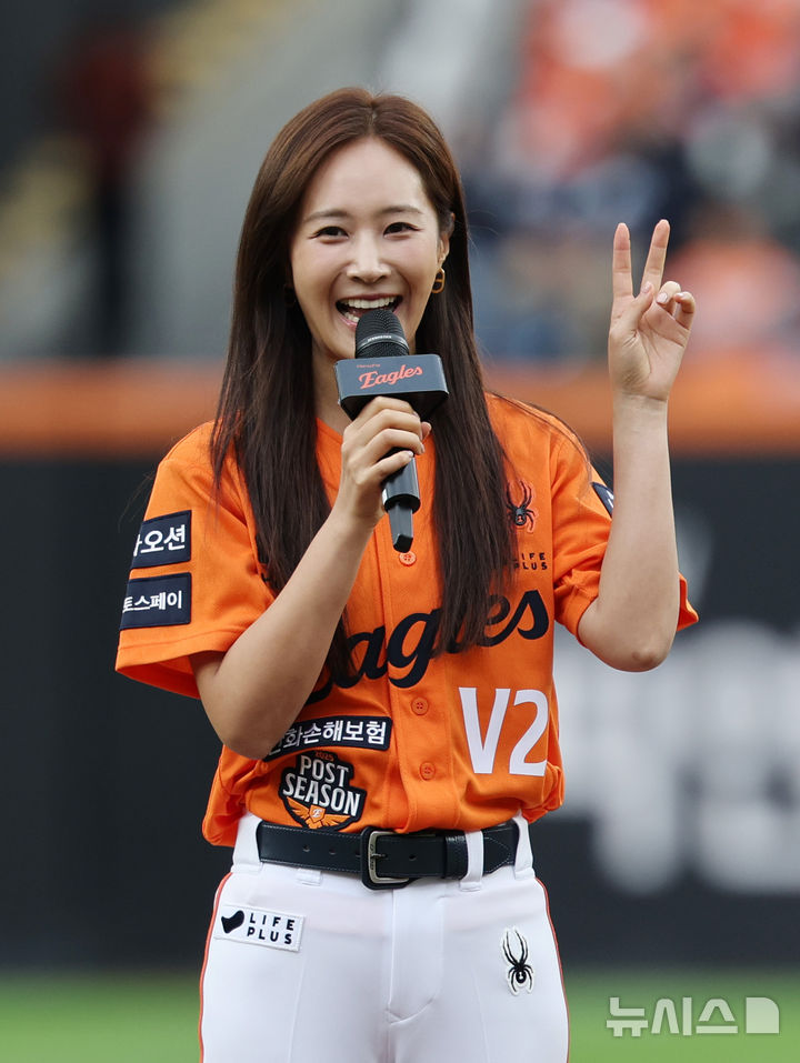 [대전=뉴시스] 김진아 기자 = 배우 겸 가수 권유리가 18일 대전 중구 한화생명볼파크에서 열린 2025 KBO 포스트시즌 삼성 라이온즈와 한화 이글스의 경기에서 시구에 앞서 파이팅을 외치고 있다. 2025.10.18. [email protected]