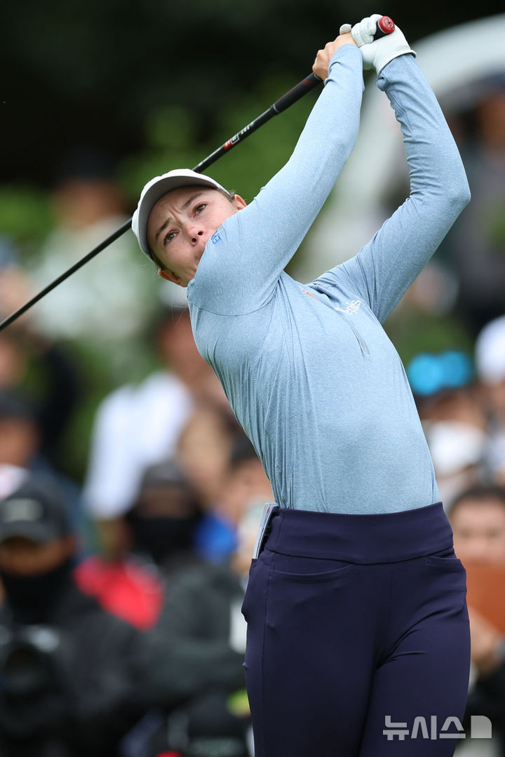 [해남=뉴시스] 권창회 기자 = 18일 오전 전남 해남 파인비치 골프링크스에서 열린 BMW 레이디스 챔피언십 2025 3라운드에서 브룩 매튜스가 2번 홀 티샷을 치고 있다. 2025.10.18. [email protected]