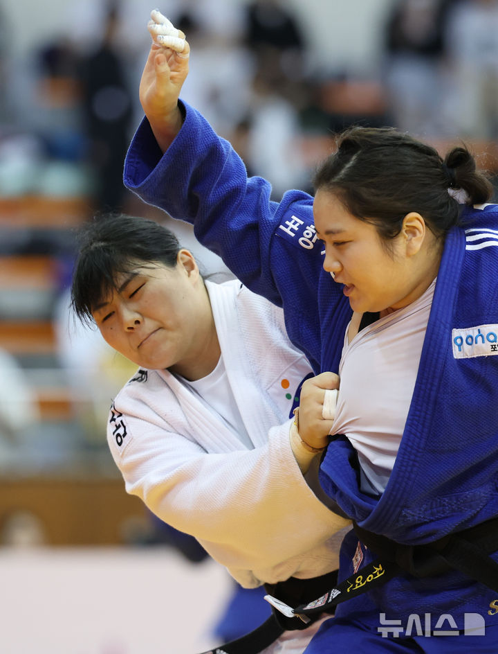[부산=뉴시스] 황준선 기자 = 김하윤(안산시청)과 손정연(포항시청)이 18일 오후 부산 남구 부경대학교 체육관에서 열린 제106회 전국체육대회 유도 여자 일반부 +78kg 8강 경기를 치르고 있다. 2025.10.18. [email protected]