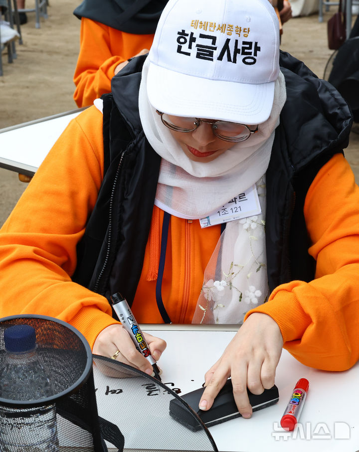 [서울=뉴시스] 최진석 기자 = 18일 오후 서울 경복궁 집옥재 앞마당에서 국립국어원 주최로 열린 '2025년 국어 사랑 받아쓰기 대회'에 참가한 외국인이 한글 실력을 겨루고 있다. 2025.10.18. [email protected]