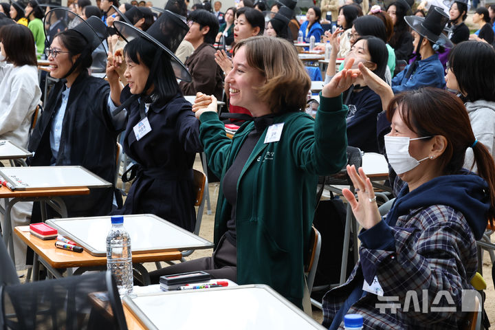 [서울=뉴시스] 최진석 기자 = 18일 오후 서울 경복궁 집옥재 앞마당에서 국립국어원 주최로 열린 '2025년 국어 사랑 받아쓰기 대회'에서 참가자들이 한글 실력을 겨루며 기뻐하고 있다. 2025.10.18. [email protected]