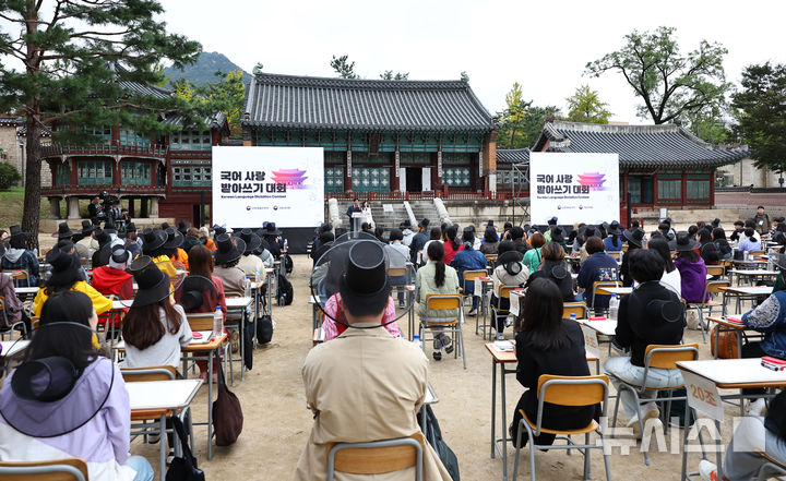 [서울=뉴시스] 최진석 기자 = 18일 오후 서울 경복궁 집옥재 앞마당에서 국립국어원 주최로 열린 '2025년 국어 사랑 받아쓰기 대회'에서 참가자들이 한글 실력을 겨루고 있다. 2025.10.18. [email protected]