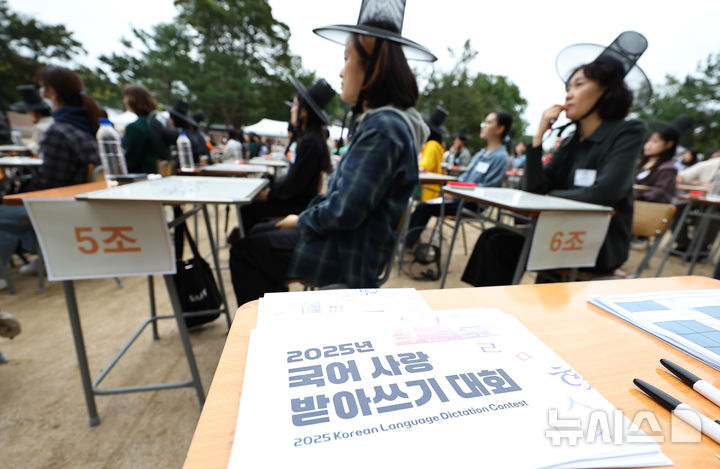 [서울=뉴시스] 최진석 기자 = 18일 오후 서울 경복궁 집옥재 앞마당에서 국립국어원 주최로 열린 '2025년 국어 사랑 받아쓰기 대회'에서 참가자들이 한글 실력을 겨루고 있다. 2025.10.18. [email protected]