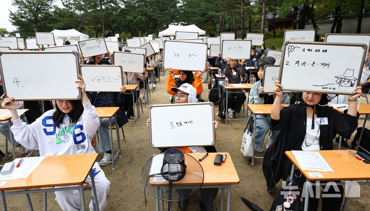 [서울=뉴시스] 최진석 기자 = 18일 오후 서울 경복궁 집옥재 앞마당에서 국립국어원 주최로 열린 '2025년 국어 사랑 받아쓰기 대회'에서 참가자들이 한글 실력을 겨루고 있다. 2025.10.18. [email protected]