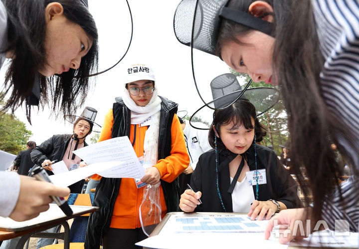 [서울=뉴시스] 최진석 기자 = 18일 오후 서울 경복궁 집옥재 앞마당에서 국립국어원 주최로 열린 '2025년 국어 사랑 받아쓰기 대회'에서 참가자들이 한글 실력을 겨루고 있다. 2025.10.18. [email protected]