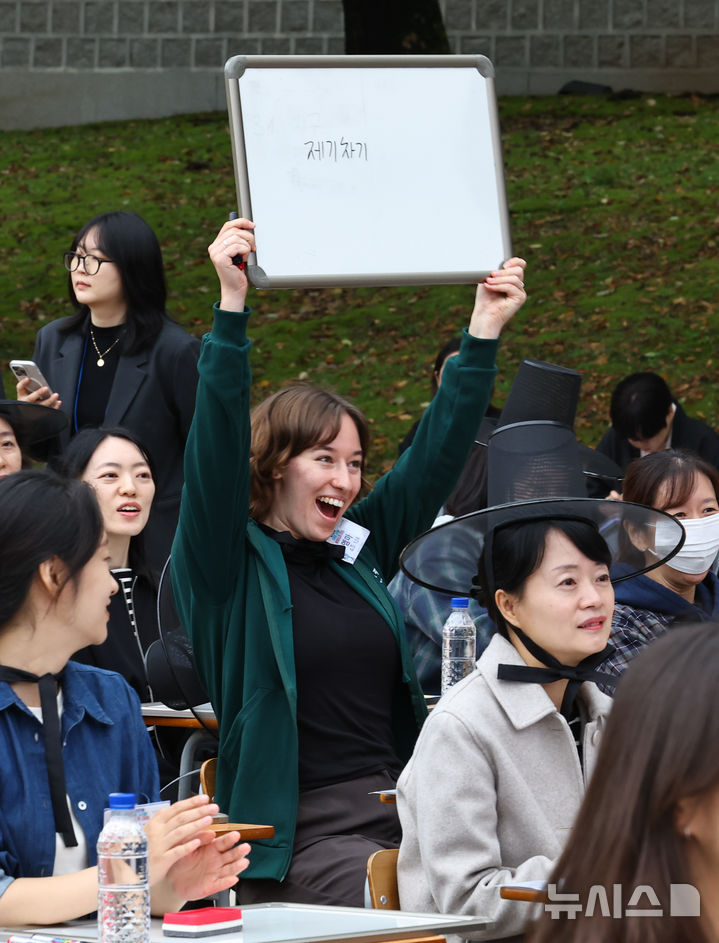 [서울=뉴시스] 최진석 기자 = 18일 오후 서울 경복궁 집옥재 앞마당에서 국립국어원 주최로 열린 '2025년 국어 사랑 받아쓰기 대회'에 참가한 외국인이 한글 실력을 겨루고 있다. 2025.10.18. [email protected]