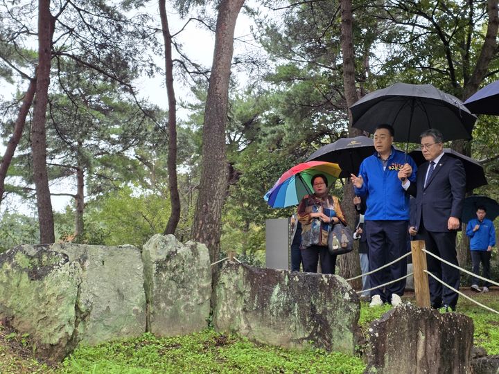 [서울=뉴시스] 허민 국가유산청장이 18일 오전 전남 화순군 소재 사적 ‘화순 효산리와 대신리 지석묘군’을 방문해 구복규 화순군수와 함께 고인돌 유적을 살펴보고 있다. (사진=국가유산청 제공) 2025.10.18. [email protected] *재판매 및 DB 금지