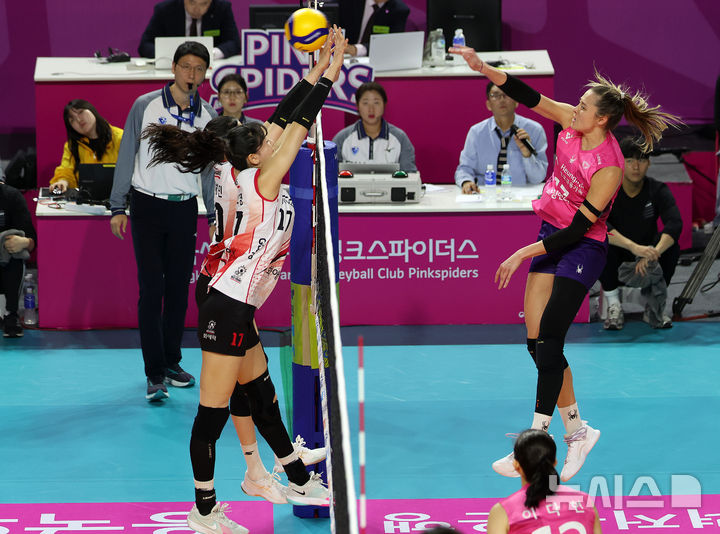 [인천=뉴시스] 이영환 기자 = 18일 오후 인천 부평구 삼산월드체육관에서 열린 진에어 2025-2026 V리그 여자부 흥국생명과 정관장의 경기, 흥국생명 레베카가 공격을 하고 있다. 2025.10.18. [email protected]