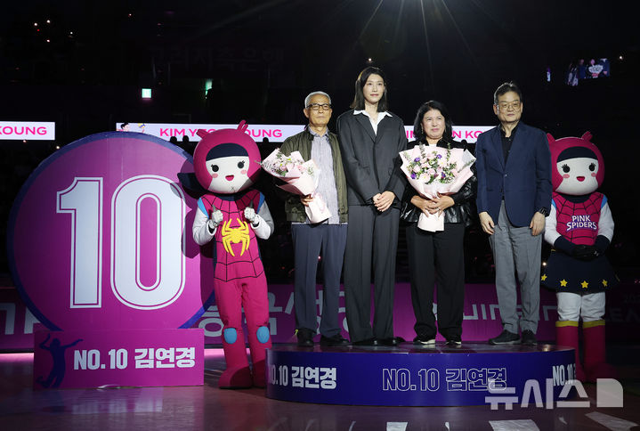 [인천=뉴시스] 이영환 기자 = 김연경이 18일 오후 인천 부평구 삼산월드체육관에서 열린 진에어 2025-2026 V리그 여자부 흥국생명과 정관장의 경기 종료 후 진행된 은퇴식에서 흥국생명 부모님, 김대현 구단주와 기념촬영을 하고 있다. 2025.10.18. [email protected]