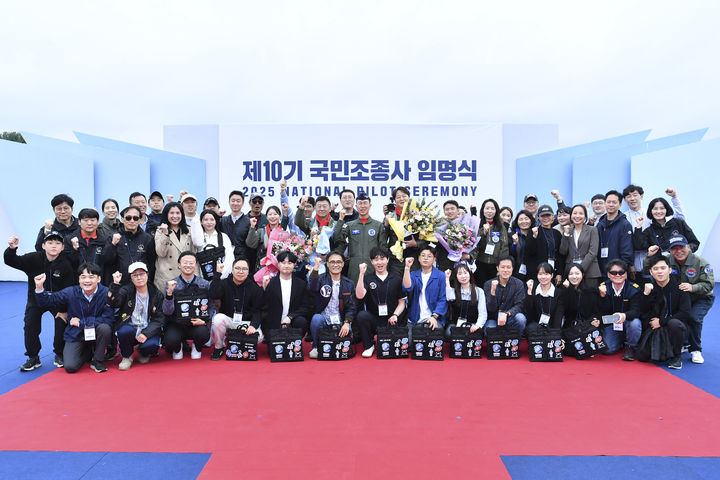 [서울=뉴시스] 이영환 기자 = 18일 경기 성남시 서울공항에서 열린 ADEX 2025 행사에서 손석락 공군참모총장 주관으로 진행된 제10기 국민조종사 임명식에서 손 총장과 국민조종사, 블랙이글스 조종사 등이 기념촬영을 하고 있다. (사진=공군 제공) 2025.10.18. [email protected] *재판매 및 DB 금지