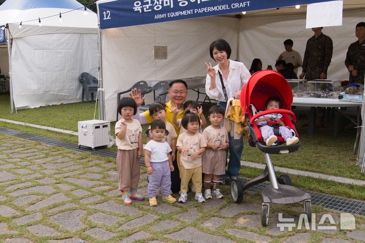 [칠곡=뉴시스] 박홍식 기자 = 김재욱 경북 칠곡군수가 19일 칠곡보 생태공원에서 열리는 제12회 칠곡낙동강평화축제장을 찾은 어린이들과 기념사진을 찍고 있다. 2025.10.19 [email protected]