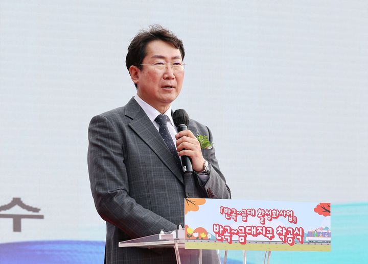 [원주=뉴시스] 19일 강원 원주시 동부권 관광 활성화를 위해 '반곡~금대 관광열차' 시범 운행식과 핵심시설인 '똬리굴' 착공식이 열린 가운데 원강수 원주시장이 시민들을 향해 인사말을 하고 있다. (사진=원주시 제공) 2025.10.19. [email protected]