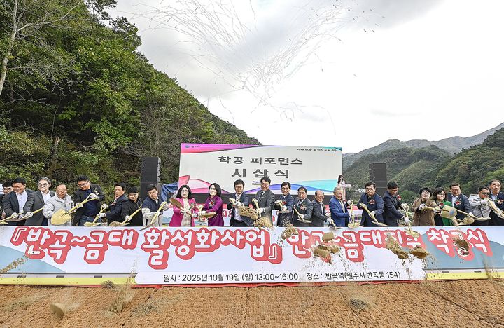 [원주=뉴시스] 19일 강원 원주시 동부권 관광 활성화를 위해 '반곡~금대 관광열차' 시범 운행식과 핵심시설인 '똬리굴' 착공식이 열린 가운데 원강수 원주시장과 조용기 원주시의장을 비롯한 시도의원, 기관단체장, 시민등이 시삽을 하고 있다. (사진=원주시 제공) 2025.10.19. [email protected]