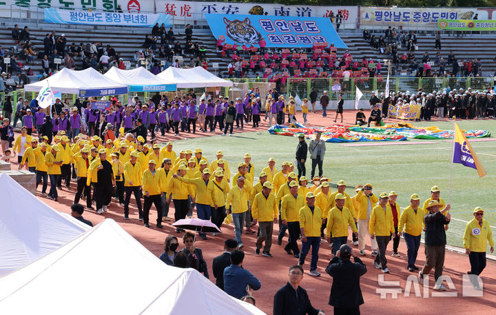[서울=뉴시스] 이영환 기자 = 19일 오전 서울 용산구 효창운동장에서 열린 제43회 대통령기 이북도민 체육대회에서 황해도 선수단이 입장을 하고 있다. 2025.10.19. [email protected]