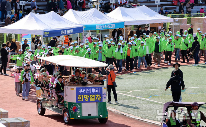 [서울=뉴시스] 이영환 기자 = 19일 오전 서울 용산구 효창운동장에서 열린 제43회 대통령기 이북도민 체육대회에서 평안북도 선수단이 입장을 하고 있다. 2025.10.19. [email protected]