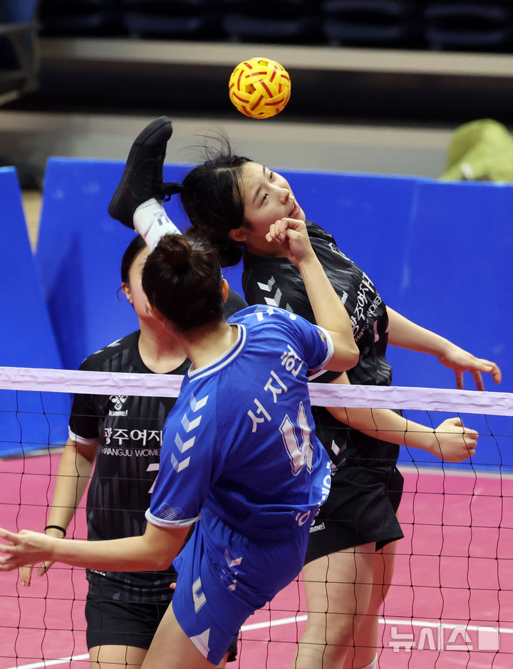 [부산=뉴시스] 하경민 기자 = 제106회 부산 전국체육대회 세팍타크로 경기가 열린 19일 부산 사직실내체육관에서 경남도와 광주시 여자팀이 기량을 겨루고 있다. 2025.10.19. [email protected]