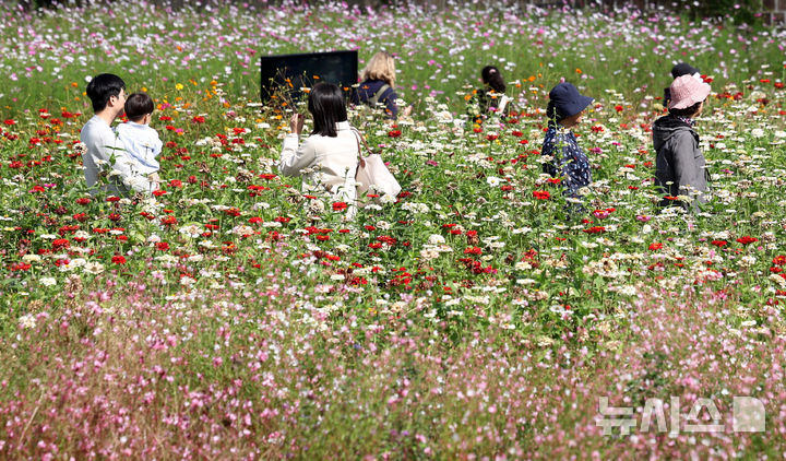 [서울=뉴시스] 추상철 기자 = 완연한 가을날씨를 보인 19일 오후 서울 종로구 열린송현 녹지광장에서 시민과 외국인관광객 등이 가을꽃을 보며 산책을 하고 있다. 2025.10.19. [email protected]