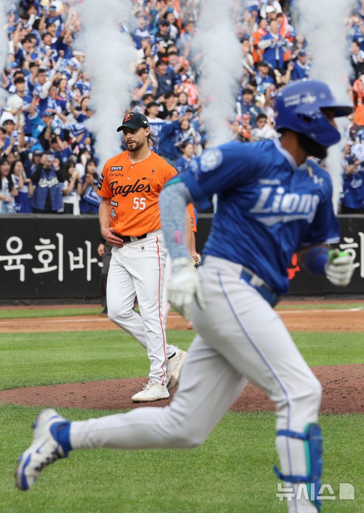 [대전=뉴시스] 김진아 기자 = 19일 대전 중구 한화생명볼파크에서 열린 2025 KBO 포스트시즌 플레이오프 2차전 삼성 라이온즈와 한화 이글스의 경기, 3회초 1사 1,3루 삼성 디아즈이게 역전 1타점 2루타 허용한 한화 와이스가 아쉬워하고 있다.2025.10.19. [email protected]