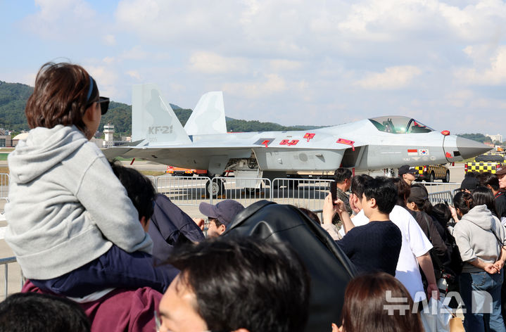 [성남=뉴시스] 이영환 기자 = 19일 오후 경기 성남시 서울공항에서 열린 서울 AEDX 2025에서 한 어린이가 KF-21을 살펴보고 있다. 2025.10.19. [email protected]