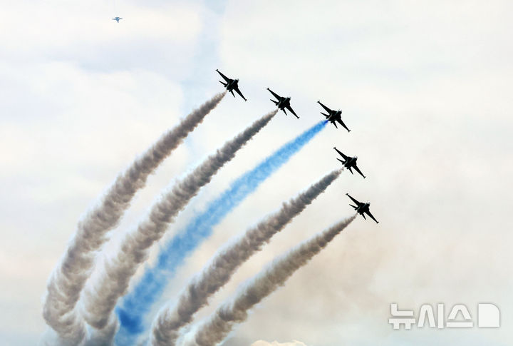 [성남=뉴시스] 이영환 기자 = 19일 오후 경기 성남시 서울공항에서 열린 서울 AEDX 2025에서 공군 블랙이글스가 비행을 하고 있다. 2025.10.19. [email protected]