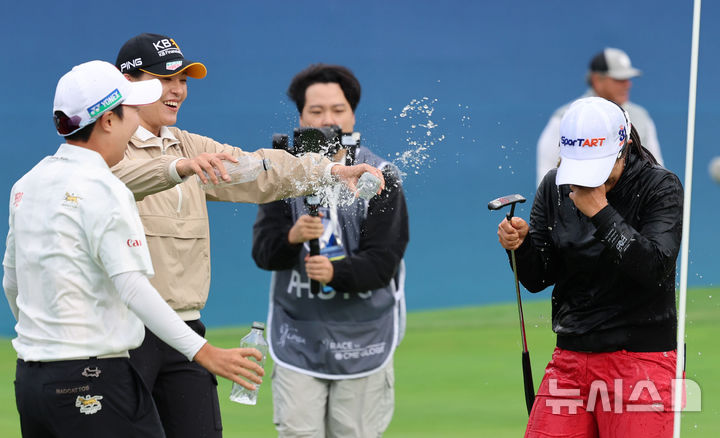 [해남=뉴시스] 권창회 기자 = 19일 오후 전남 해남 파인비치 골프링크스에서 열린 BMW 레이디스 챔피언십 2025 파이널 라운드에서 24언더파로 최종우승한 김세영이 동료 선수들로부터 축하를 받고 있다. 2025.10.19. [email protected]