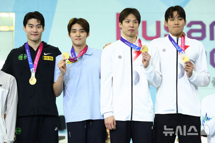 [부산=뉴시스] 황준선 기자 = 19일 부산 동래구 부산사직종합운동장 실내수영장에서 열린 제106회 전국체육대회 경영 남자 일반부 계영 800m에서 우승한 강원도청 황선우(왼쪽부터), 김우민, 양재훈, 김영범이 시상식에서 기념촬영 하고 있다. 2025.10.19. [email protected]