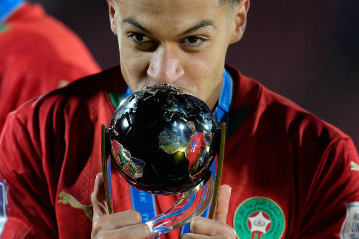 [산티아고=AP/뉴시스] 모로코의 야신 칼리피가 19일(현지 시간) 칠레 산티아고 에스타디오 나치오날에서 열린 2025 국제축구연맹(FIFA) 20세 이하(U-20) 월드컵 결승전에서 아르헨티나를 꺾고 우승한 후 트로피를 들고 입 맞추고 있다. 모로코는 결승에서 최다 우승 팀 아르헨티나를 2-0으로 꺾고 사상 처음으로 U-20 월드컵 정상에 올랐다. 2025.10.20.