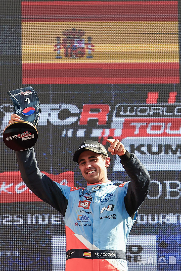 [서울=뉴시스] 현대자동차는 지난 17일부터 19일까지 강원도 인제 스피디움에서 열린 2025 TCR 월드투어 제6라운드에서 현대차 더 뉴 엘란트라 N TCR(국내명: 더 뉴 아반떼 N TCR)가 우승을 차지했다고 20일 밝혔다. 사진은 미켈 아즈코나 선수가 우승을 차지하고 기뻐하는 모습. (사진=현대자동차 제공) 2025.10.20. [email protected] *재판매 및 DB 금지