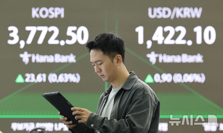 [서울=뉴시스] 권창회 기자 = 20일 오전 서울 중구 하나은행 딜링룸에서 딜러들이 업무를 보고 있다. 코스피가 전 거래일 대비 26.51포인트(0.71%) 상승한 3775.40에 출발했다. 원달러 환율은 0.9원 오른 1422.1원으로, 코스닥지수는 5.44포인트(0.63%) 오른 864.98에 거래를 시작했다. 2025.10.20. [email protected]
