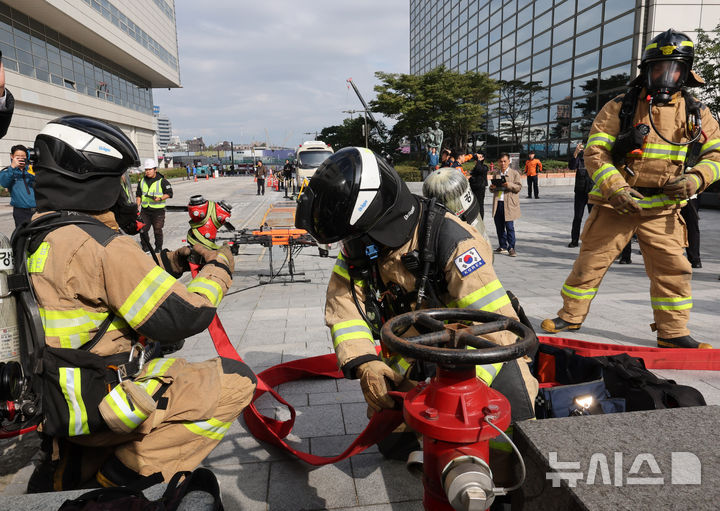 [서울=뉴시스] 배훈식 기자 = 2025 강남구 안전한국훈련 긴급구조 종합훈련이 진행된 20일 오후 서울 강남구 코엑스에서 소방대원들이 화재진압 훈련을 하고 있다. 2025.10.20. [email protected]