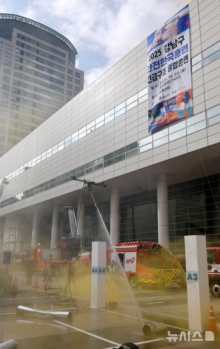 [서울=뉴시스] 배훈식 기자 = 2025 강남구 안전한국훈련 긴급구조 종합훈련이 진행된 20일 오후 서울 강남구 코엑스에서 소방대원들이 드론을 활용한 화재 진압 훈련을 하고 있다. 2025.10.20. [email protected]